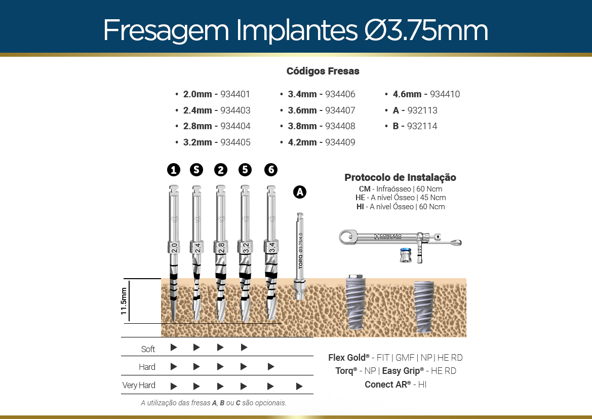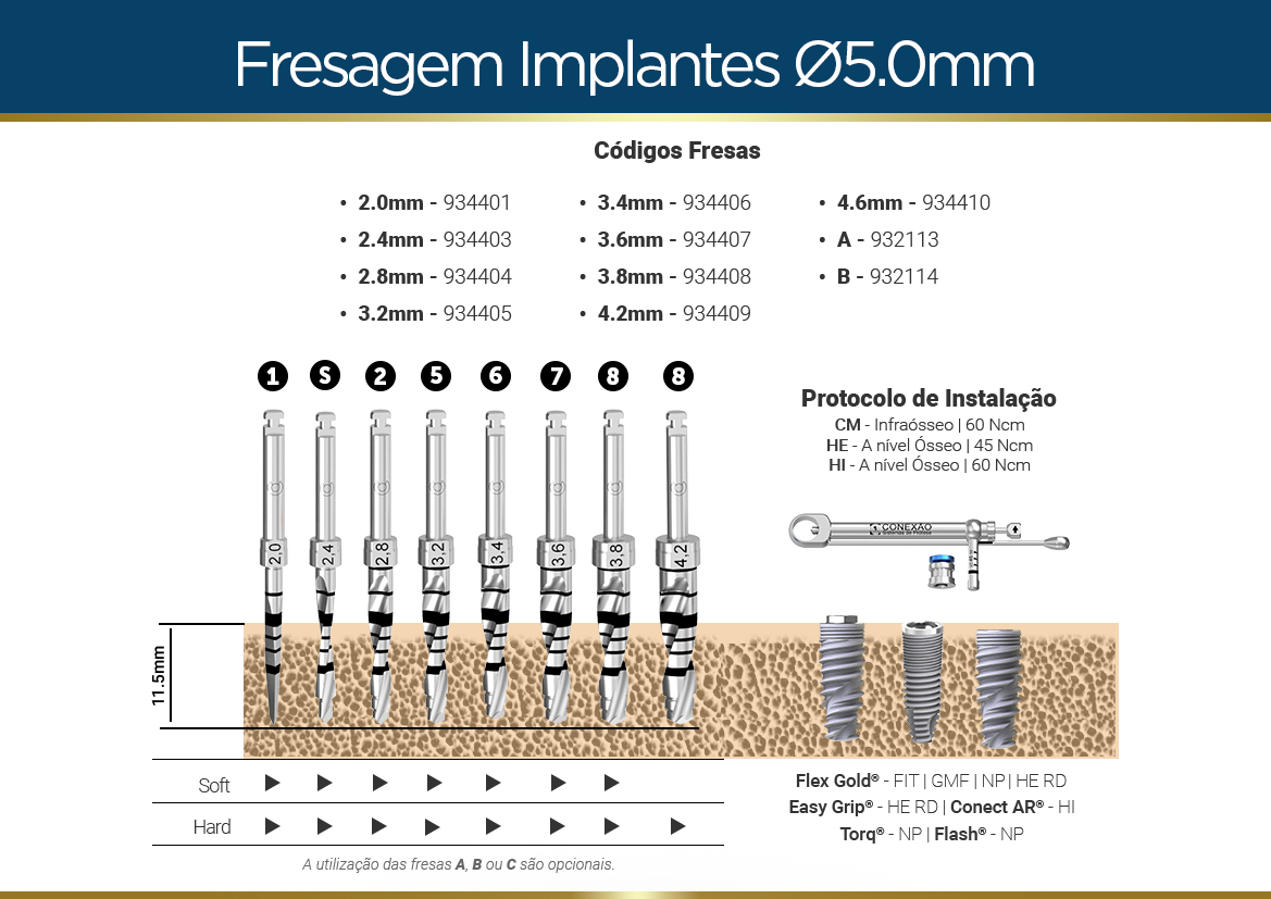 | Densidade Óssea | ⌀3,5 | ⌀3,75 | ⌀4,3 | ⌀5,0 |