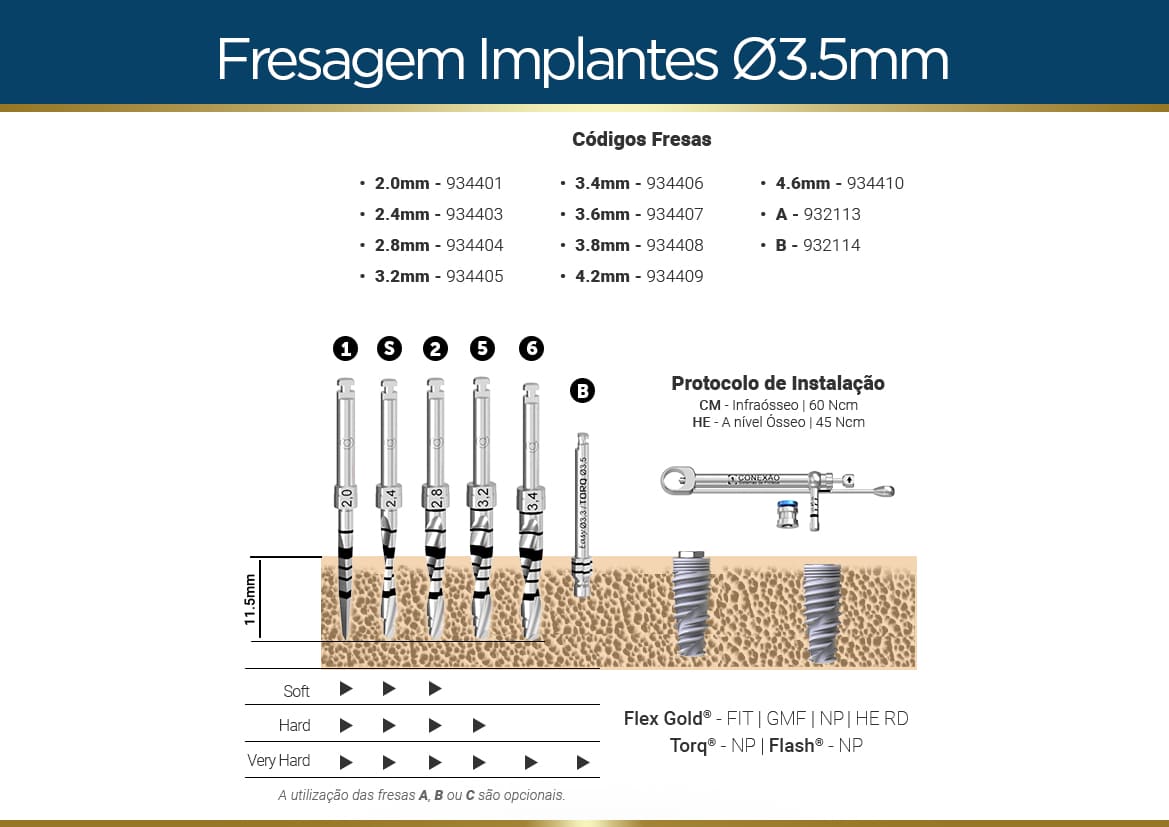 | Osso Médio | 2,8mm (3,2mm)* | 3,2mm (3,4mm)* | 3,6mm (3,8mm)* | 3,8mm (4,2mm)* |